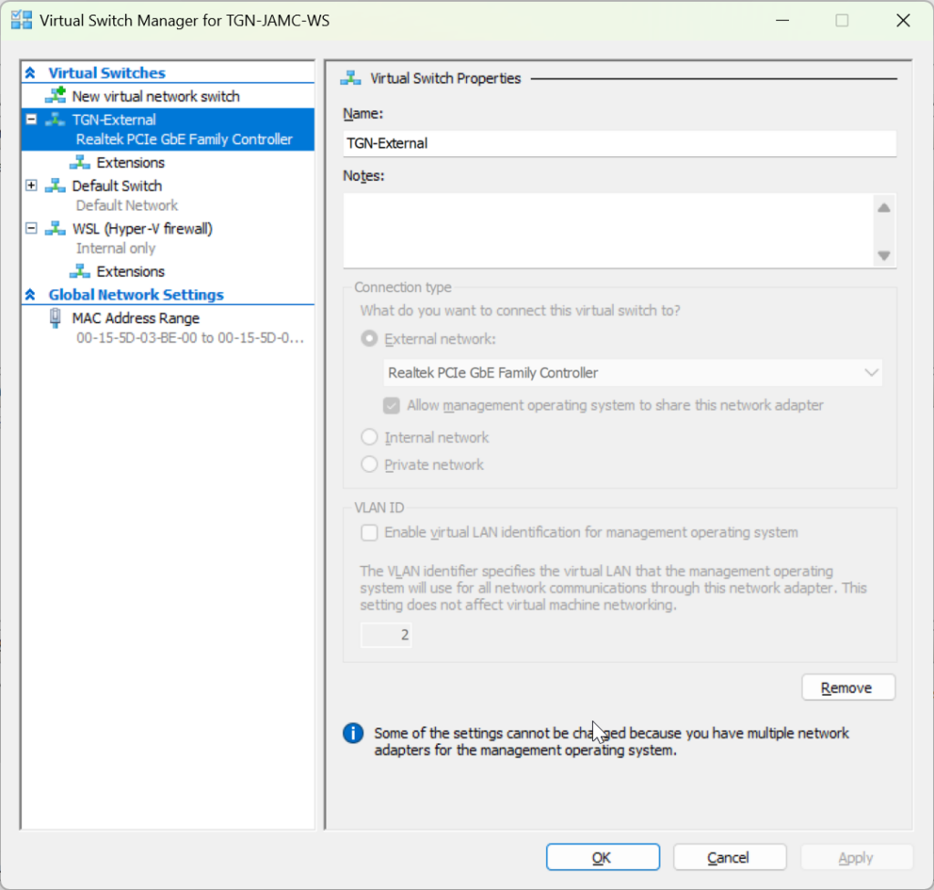 Here is a screen shot of the Hyper-V Virtual Switch Manager properties dialog, it shows I have a virtual switch external network connected to my ethernet adaptor on my Windows 11 computer