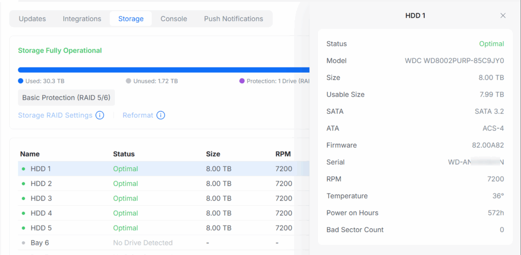 Finally map to the physical enclosure using the Unifi Protect GUI and SERIAL number by clicking on each entry under Settings => Control Plane => Storage and get the bay number info for each HDD
