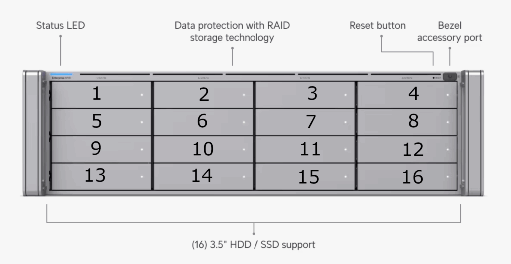 The drive layout to the physical enclosure is marked on each column of bays but here it is marked on the front of each bay, more obviously